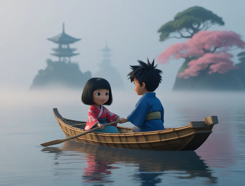 Bir sabah, deniz çarşaf gibi dümdüzken ve etrafı hafif bir sis kaplamışken, Yuki ve Kenji küçük bambu sandallarına binip kürek çekmeye başlamışlar.