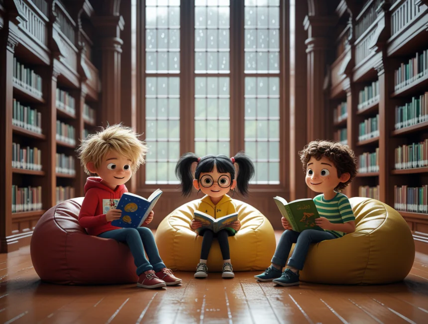 Her biri raflardan ilgisini çeken bir kitap almış. Aras uzayla ilgili, Elif dinozorlarla ilgili, Kerem ise komik kedilerle ilgili bir kitap seçmiş. Dışarıdaki yağmurun sesi, kitap okurken onlara huzurlu bir müzik gibi gelmeye başlamış. "Biliyor musunuz," demiş Elif fısıldayarak, "Yağmur yağarken sıcak bir yerde kitap okumak ne kadar keyifliymiş."