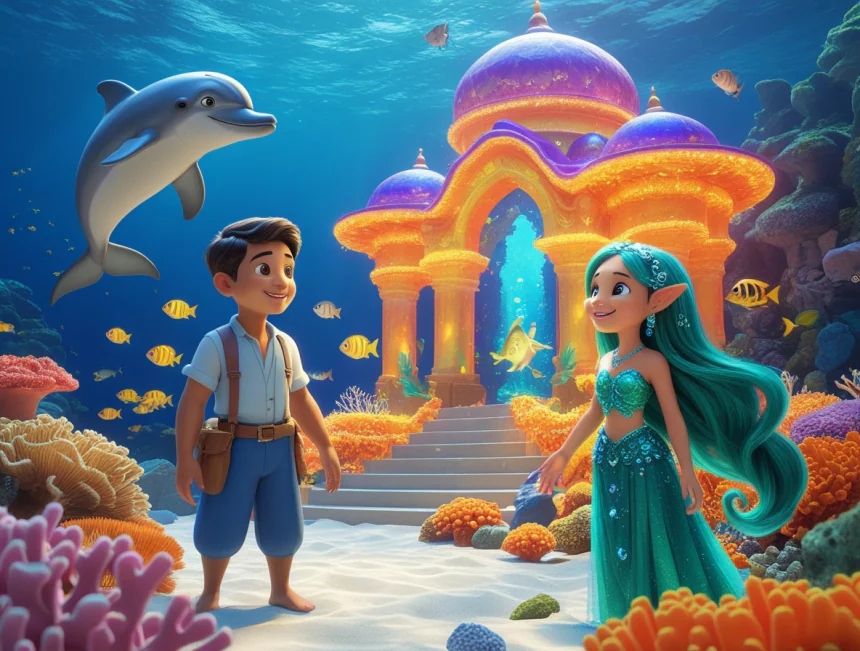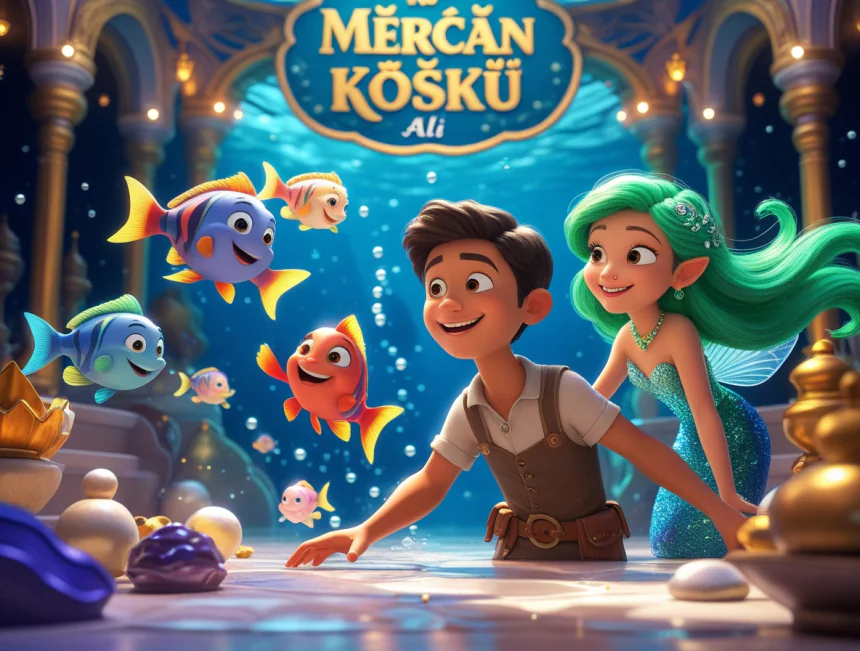 Yunus balığı, Ali'ye denizin derinliklerine doğru gitmesini işaret etmiş. Ali şaşırmış ama yunusun peşinden gitmeye karar vermiş. "Haydi bakalım, kısmet nereyeymiş!" diye mırıldanmış. Yunus, Ali'yi yemyeşil suların altındaki ışıl ışıl bir yere götürmüş. Burası, mercanlardan yapılmış, rengarenk balıkların yüzdüğü, pırıltılı bir köşk varmış! Her yer "pırıl pırıl" parlıyormuş.