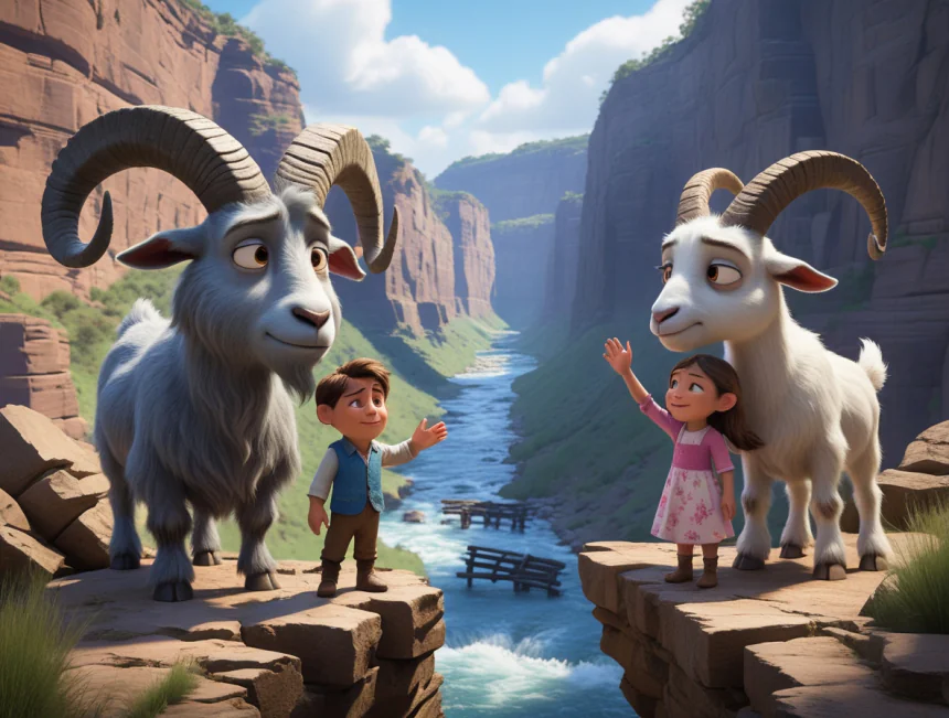 Gri Keçilerin tarafında Ali adında, gözleri pırıl pırıl, merhametli bir çoban çocuk; Beyaz Keçilerin tarafında ise örgülü saçları rüzgarda uçuşan Zeynep adında neşeli bir çoban kız yaşarmış. Ali ve Zeynep, nehrin iki kıyısından birbirlerine el sallarmış. "Keşke yan yana oynayabilsek," diye iç geçirirlermiş. Ama sürülerin yaşlı ve inatçı liderleri Koca Boynuz ve Sivri Sakal, "Hayır! Karşı tarafa bakmak bile yasak! Onlar bizimle konuşmuyor, biz de onlara küsüz!" diye inat ederlermiş.