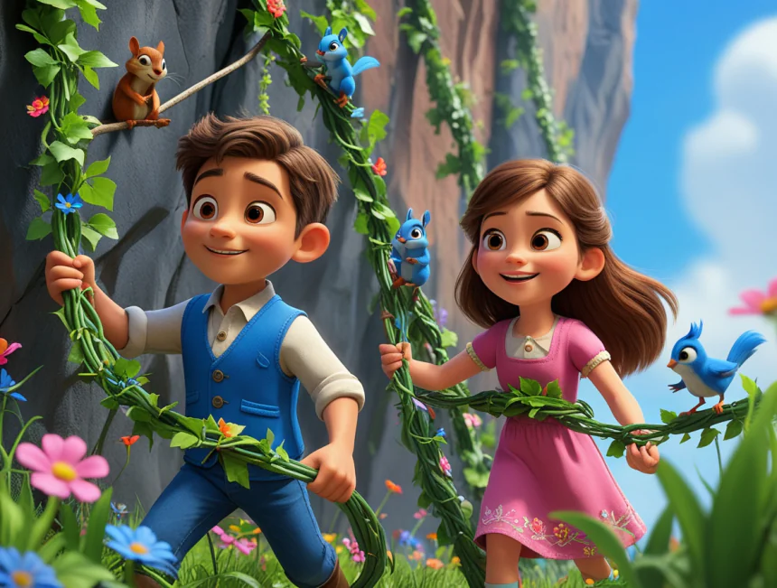 Bir de ne görsünler? Ali ve Zeynep, sarmaşıkları birbirine fırlatıp havada düğümlemişler. Ortaya sallanan ama çok güzel görünen Çiçekten Bir Köprü çıkmış!