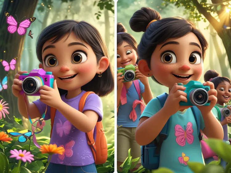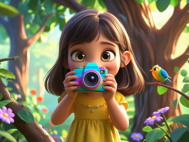 Çocuklar öğretmenlerinin etrafında toplanmış. Öğretmen fotoğraf makinesini tutmuş ve bir ağaç dalının yanına doğru ilerlemiş. "Bu makine, dünyayı yakalayan sihirli bir kutu gibidir," demiş. "Birçok farklı türde fotoğraf makinesi var. Ama hepsinin ortak bir amacı vardır: Her anı, her ayrıntıyı kaydetmek!"