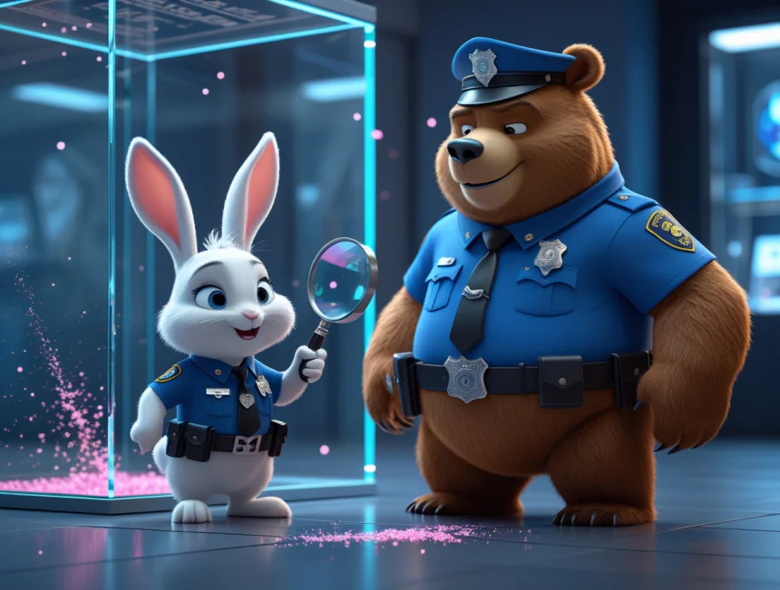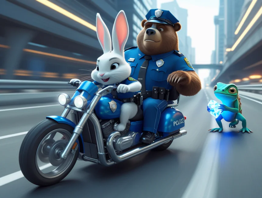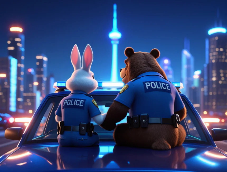 Şehrin güvenliğinden sorumlu karakolda iki ortak çalışırmış: Biri, yerinde duramayan, kahve içmiş gibi sürekli "zıp zıp" zıplayan, uzun kulaklı polis tavşan Roka. Diğeri ise onun tam tersi; konuşması bile yavaş olan, bal yemeyi çok seven, dev gibi ama pamuk kalpli polis ayı Bambam.