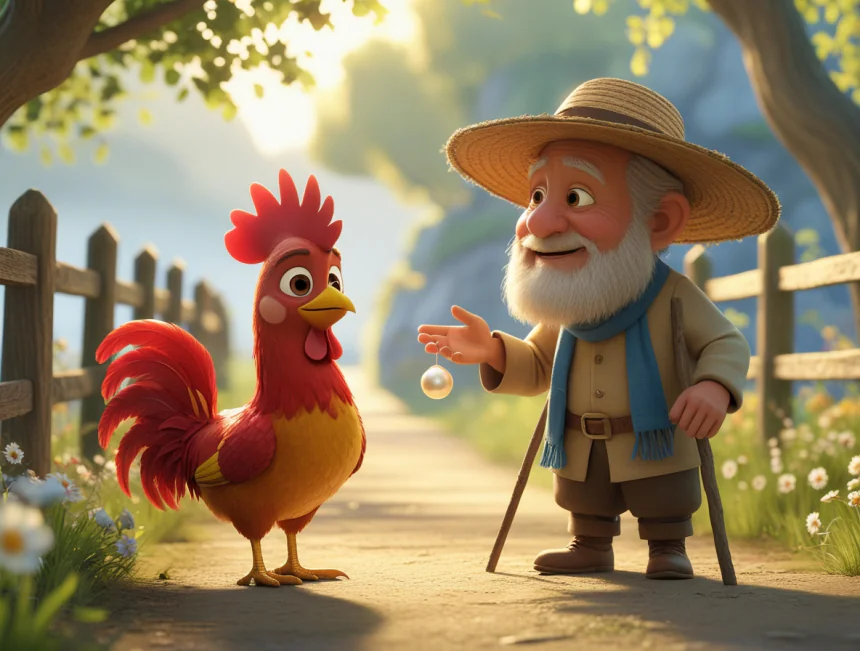 Bir anlık hevesle bulduğu inciyi “Pıt!” diye kenara atmış. Parlak inci çimenlerin arasına düşmüş, bir yaprağın altında kaybolmuş. O sırada köyün bilge yaşlısı oradan geçiyormuş. Elinde bastonu, yüzünde tatlı bir tebessüm varmış. Horozun bir şey fırlattığını görünce durmuş: