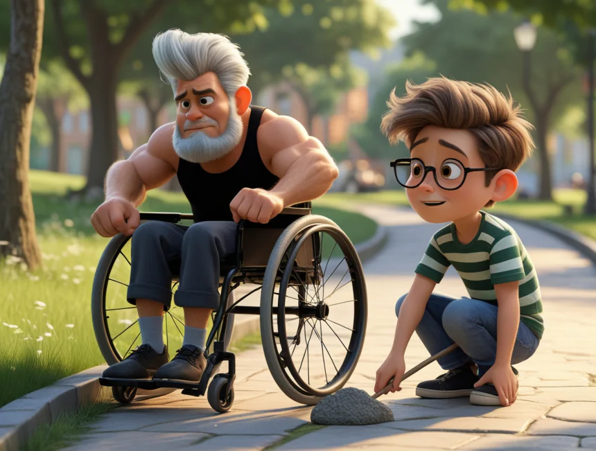 Carl sessizce yanına gelmiş. "Johnny, biraz kenara çekil bakalım" demiş. Sandalyenin tekerleklerine bakmış, "Aha, taş sıkışmış buraya!" demiş. Küçük bir dal bulmuş, "Hop!" diye taşı çıkarmış. Sandalye rahatça hareket etmiş. Yaşlı adam gülümsemiş: "Çok teşekkür ederim evladım. Güç kaslardan değil, akıldan gelirmiş demek!" Johnny'nin yüzü kıpkırmızı olmuş.