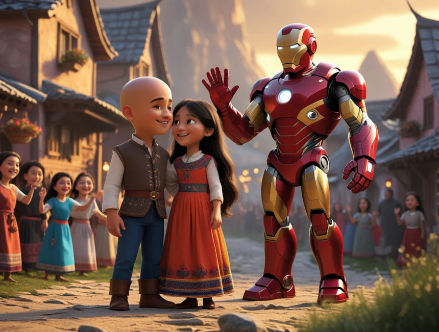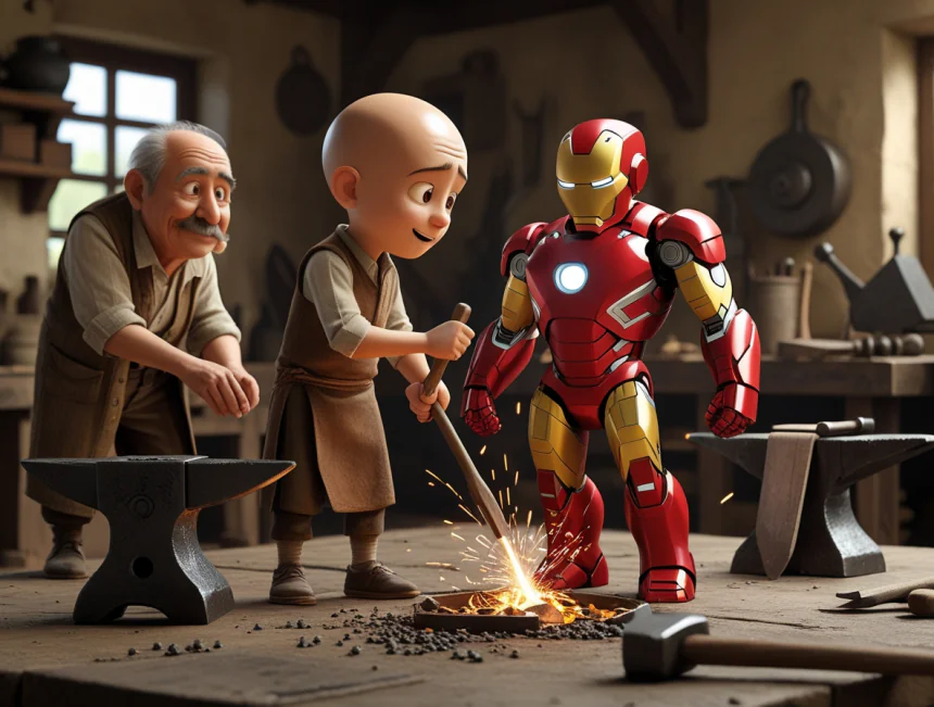 Bir gün köyün üzerinde garip bir şey olmuş. Gökten parlak kırmızı ışıklar saçan metal bir adam düşmüş! Keloğlan merakla yaklaşmış: "Sen kimsin be kardeşim?" Demir Adam başını kaldırmış: "Ben Tony, yani Demir Adam. Zırh arızalandı, yere düştüm."