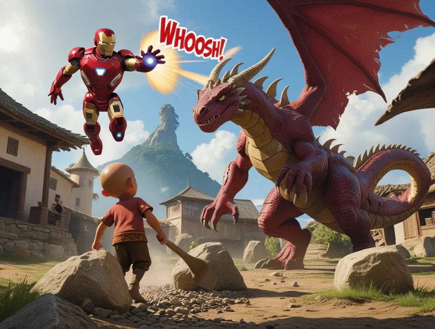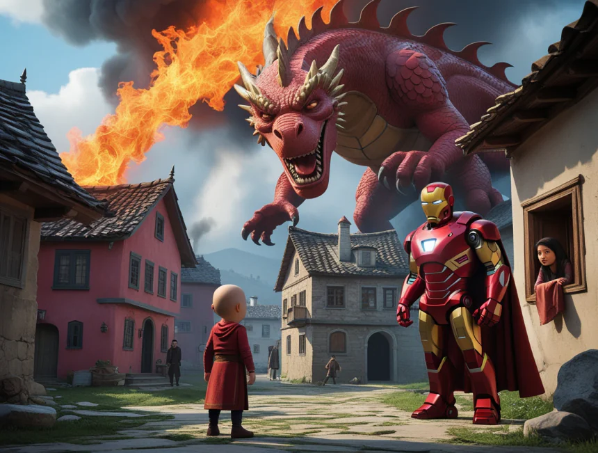 Keloğlan cesaretle öne çıkmış: "Sen kimsin be ejder! Bu köye dokundurmam!" demiş. Demir Adam da zırhını giymiş: "Ben de yardım edeceğim sana, arkadaş!" demiş. İkisi birlikte planlar yapmaya başlamış. Keloğlan'ın zekası, Demir Adam'ın teknolojisiyle birleşmiş. "Sen havadan saldır, ben yerden!" demiş Keloğlan.