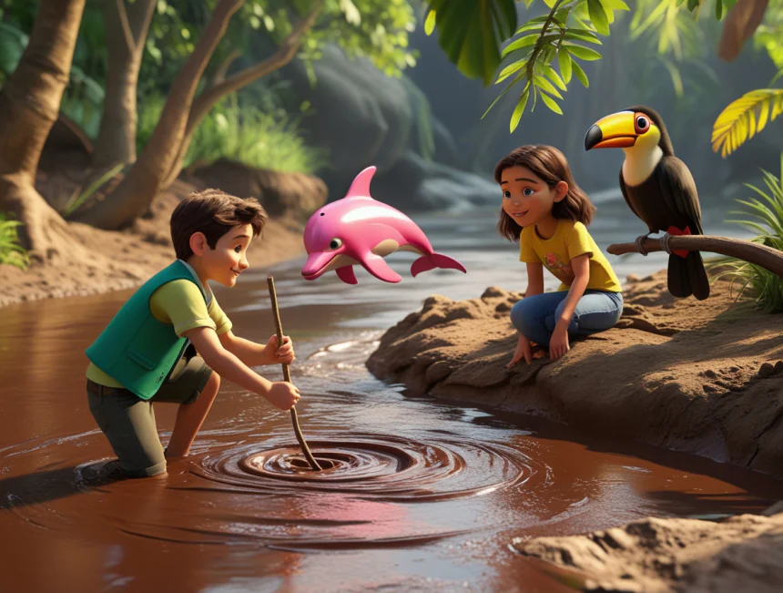 Gerçekten de Amazon'un o meşhur kahverengi, çamurlu suyu burada o kadar yoğun ve tatlı görünüyormuş ki, sanki dev bir çikolata şelalesinden akıyormuş. Nehrin kenarında pembe yunuslar, çikolata rengi sularda neşeyle zıplıyormuş.