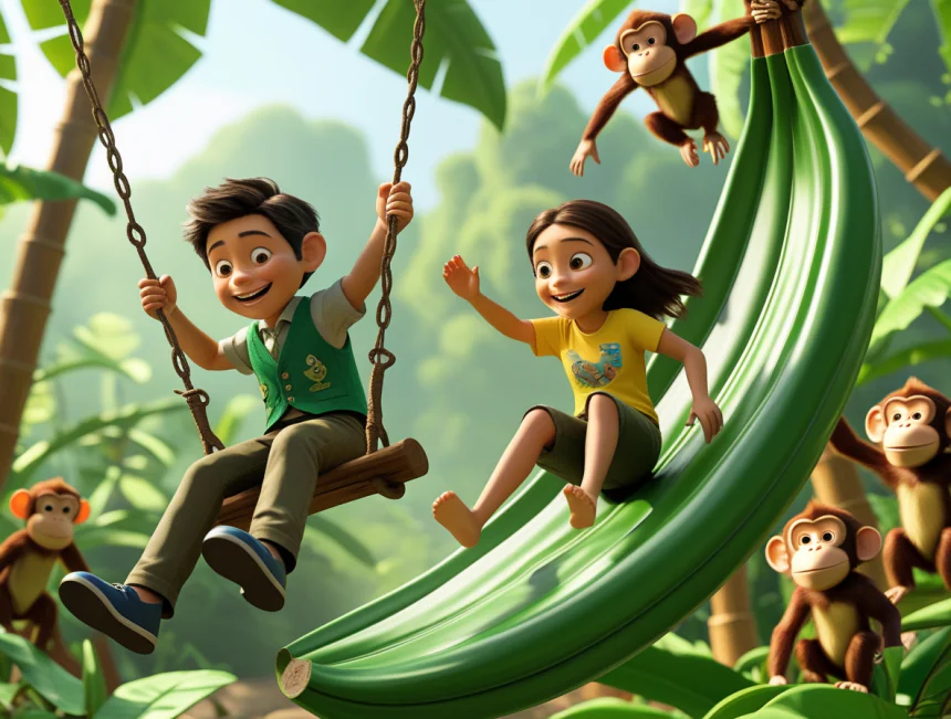 Sonunda devasa bir sarmaşık perdesini araladıklarında gözlerine inanamamışlar! Karşılarında efsanevi Masal Parkı duruyormuş. Ama burası şehirdeki parklara benzemiyormuş. Burada salıncaklar plastikten değil, ağaçlardan sarkan sağlam ve kıvrımlı sarmaşıklardanmış. Kaydıraklar, devasa ve pürüzsüz muz yapraklarındanmış.