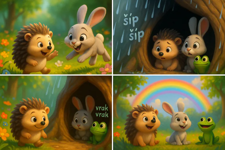Minik Kirpi ve Tavşan hemen bir ağaç kovuğuna saklandılar. Kurbağa Amca da yanlarına geldi. "Vrak vrak vrakk, yağmur ne güzel yağıyor!" dedi Kurbağa.