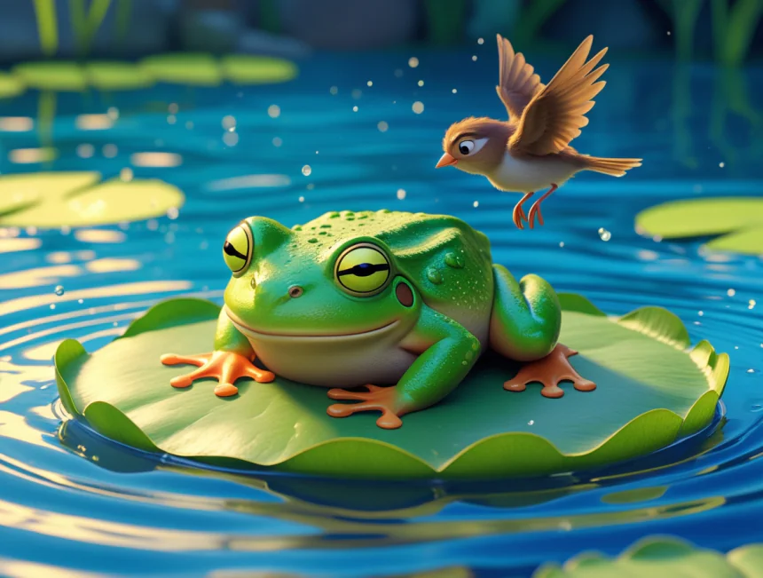 Cik Cik, oradaki küçük göle uçmuş. Nilüfer yaprağının üzerinde yeşil Kurbağa uyuyormuş.
