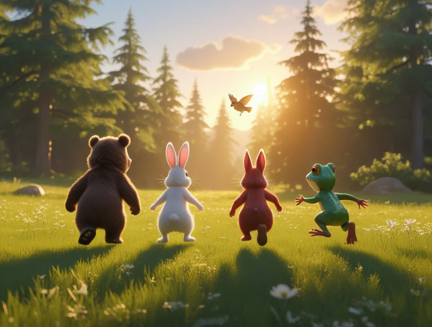 Artık herkes uyanmış! Ayıcık, Tavşan, Kurbağa ve Sincap dere kenarına inmişler.