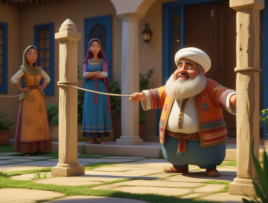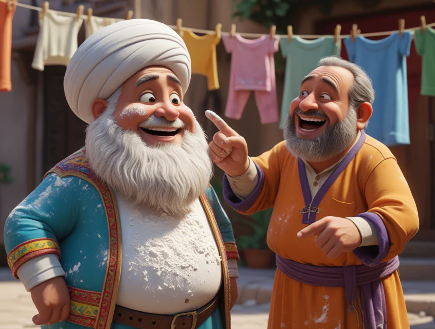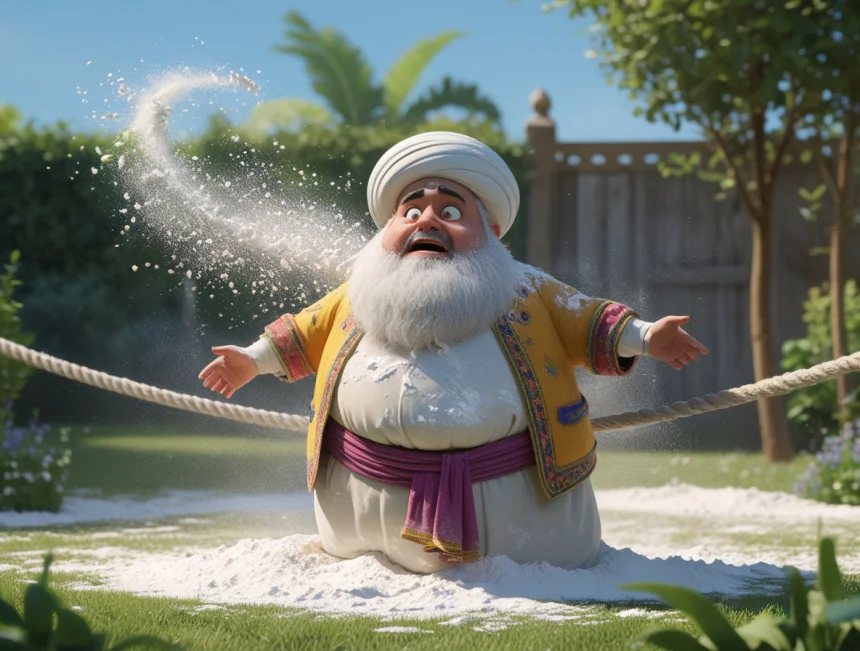 Nasreddin Hoca komşularının sözlerini yanlış anlayıp ipe un seriyor.