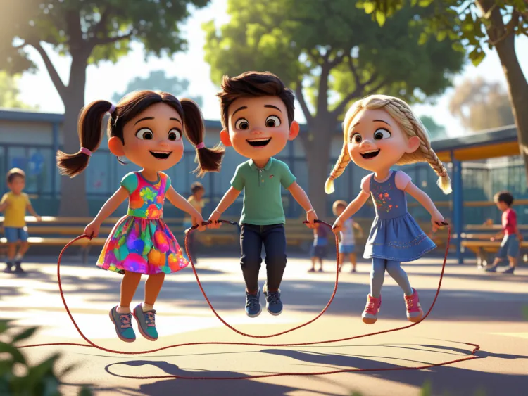 Teneffüs zamanı geldiğinde bahçede oyun oynamışlar. Arda "Asel, gel beraber ip atlayalım" demiş. Defne de "Ben de katılayım" demiş gülerek. Üçü beraber "Bir iki üç hop!" diye sayarak ip atlamışlar. Asel çok eğlenmiş ve "Ne kadar güzel arkadaşlarım var!" diye düşünmüş sevinçle.