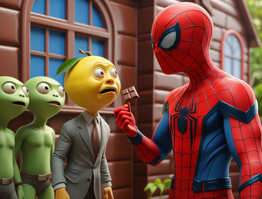 Örümcek Adam, çikolatayı Limon Kafa'ya uzatmış. "Belki de biraz tatlı yersen, kalbin de tatlanır ve gülümsemeye başlarsın."