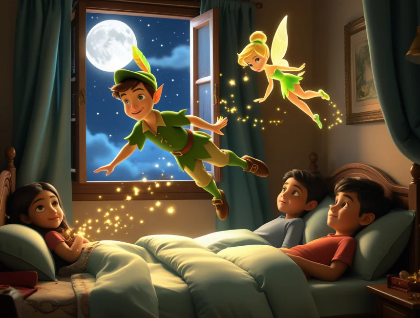 Zeynep çok heyecanlanmış: "Gerçekten uçabilir miyim?" Peter gülümsemiş: "Tabii! Sadece güzel düşünceler düşün ve peri tozuna inan!" Tinker Bell altın renginde peri tozu serpmiş üçünün üzerine. "Düşünün, inanın, uçun!" diye bağırmış Peter. Çocuklar "Vay! Uçuyoruz!" diye sevinmişler.