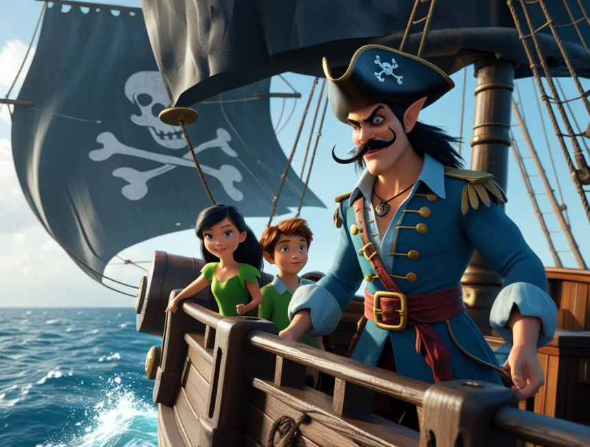 Ama adada kötü Kaptan Hook da varmış! Büyük siyah bıyıkları, elinde kanca varmış. Peter Pan bir keresinde ona karşı savaşırken onun elini kesmişmiş. O yüzden Peter'dan çok nefret edermiş. "Ben o Peter Pan'i yakalayacağım!" diye bağırırmış hep. "Grrr!" diye öfkeyle dişlerini gıcırdatırmış.