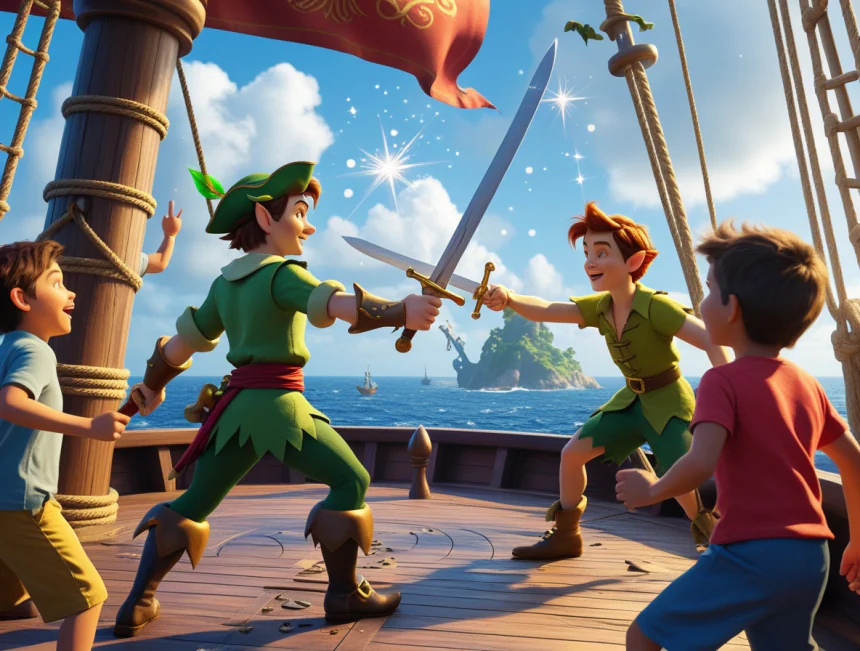 Büyük bir kılıç düellosu başlamış gemide. "Klang klang!" diye kılıçlar çarpışmış. Peter çevik hareketlerle Hook'u alt etmiş. Zeynep ve kardeşlerini kurtarmış. Kaptan Hook korkuyla "Ben kaçıyorum!" diye denize atlamış. Gerçek timsah da onu kovalamaya başlamış.