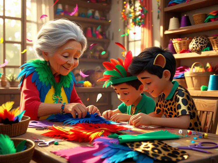 Gustavo'nun büyükannesi Maria çok bilge bir kadınmış ve onlara yardım etmeyi teklif etmiş. "Karnaval sadece kostüm değildir çocuklar" demiş gülümseyerek. "Asıl önemli olan kalbinizdeki müzik ve dostluğunuzdur." Maria onlara eski kumaşlardan kostüm yapmayı öğretmiş. "Şıp şıp!" diye makasla kestikleri renkli kumaşlar güzel kostümlara dönüşmüş. Gustavo papağan, Pepe ise jaguar kostümü yapmış.