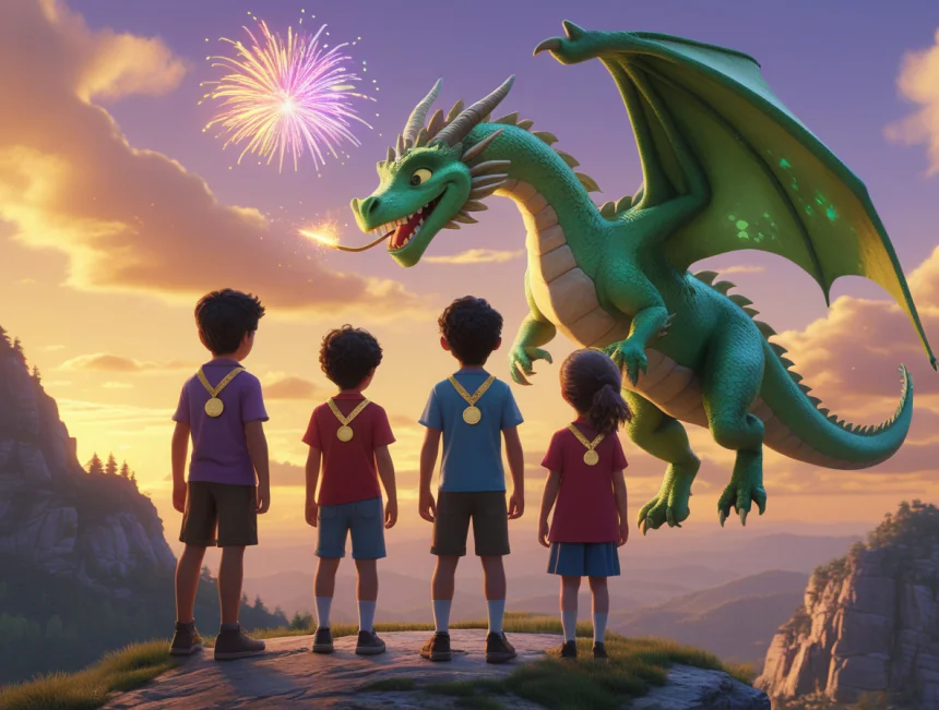 Anne Ejderha, "Siz benim en değerli hazinemi kurtardınız," demiş. "Sizi 'Ejderha Muhafızları' ilan ediyorum." Ve her birine, karanlıkta parlayan ve onlara her zaman doğru yolu gösterecek olan Ejderha Pulu Madalyası hediye etmiş.