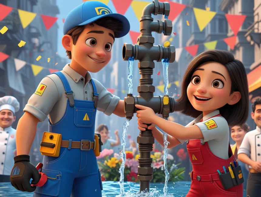 Sonra su borularına bakmışlar. "Şırıl şırıl!" sesi yoktu çünkü borular tıkanmışmış. Elif "Hop!" diye özel aletini çıkarmış. Arda da yardım etmiş. "Glu glu!" sesiyle suları temizlemişler. Musluklar tekrar "Şırıl şırıl!" sesiyle akmaya başlamış. Aşçı "Harika!" demiş ve lezzetli yemekler pişirmeye başlamış. Çiçekçi de çiçeklerini sulayabilmiş.