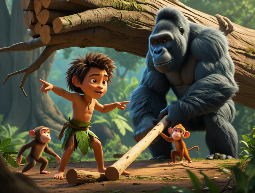 Herkes çaresizce bakışırken, Tarzan öne çıkmış. "Güçle değil, akılla yapmalıyız!" demiş. Hemen ormandaki en sağlam sarmaşıkları toplamış. Uzun ve kalın bir kütüğü, devrilen ağacın altına bir destek gibi yerleştirmiş. Sarmaşıkları kütüğe bağlamış ve diğer ucunu fillerin hortumuna vermiş.