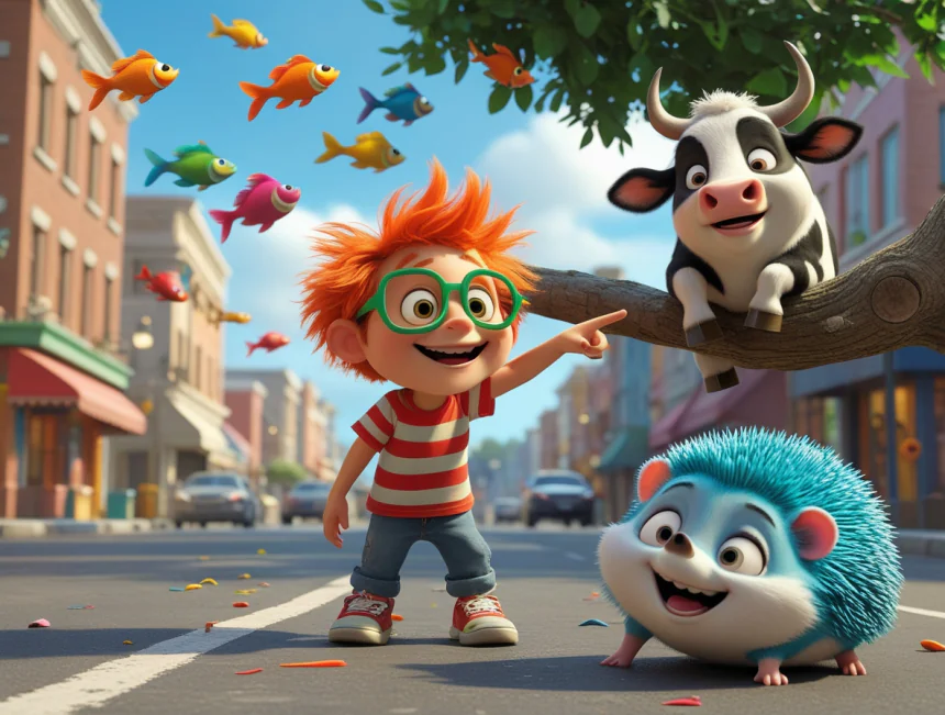 En komiği ise pastanedeymiş. Fırıncı Amca, dondurmayı fırına koyup ısıtıyor, sıcak çorbayı ise külahla satıyormuş. İnsanlar önce tatlı yiyip, sonra ana yemek yiyorlarmış. Bir inek ağacın dalına tünemiş ve geçenlere "Cik cik cik!" diye ötüyormuş.