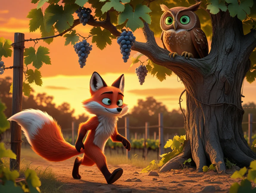 Tam o sırada tilki kendini avutmak için bir şey düşünmüş. Başını kaldırmış, burnunu çekmiş, küçümseyerek bakmış üzümlere. Yakındaki ağaç kovuğunda oturan bilge baykuş bütün olanları görmüş. Başını sallamış: "Vay vay vay! Tilki o kadar uğraştı ama üzümlere ulaşamadı. Şimdi de yapamadığı şeyi kötülüyor, bahane üretiyor" demiş. "Ulaşamadığı şeyi istemiyormuş gibi yapıyor. Bu doğru değil!" diye düşünmüş.