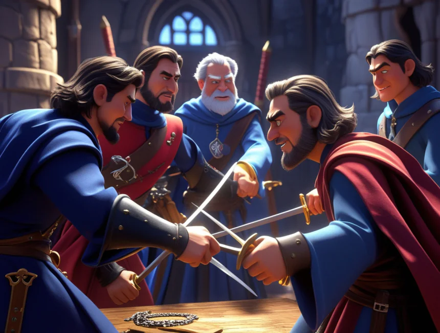Athos akıllı planlar yapmış: "Endişelenme kraliçem, biz seni koruyacağız." Porthos güçlü kaslarını oynatmış: "Ben kötülerin hepsini kovacağım!" Aramis nazikçe gülümsemiş: "Birlikte her şeyin üstesinden gelebiliriz." Üçü birden kılıçlarını çekmiş ve "En güzel dostluk kazanacak!" diye ant içmişler.