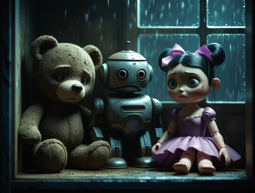 Bir varmış bir yokmuş, güzel ama eski bir şehrin dar sokaklarından birinde, pencereleri tozla kaplanmış, tabelasının bir harfi düşmüş "Unutulmuş Oyuncak Dükkanı" adında hüzünlü bir dükkan varmış. Dükkanın içi sakin ve sessizmiş, raflar ise yıllardır dokunulmamış oyuncaklarla doluymuş. Burada, bir zamanlar çocukların gözdesi olan ama artık eskidiği için kenara atılmış üç sıkı dost yaşarmış.