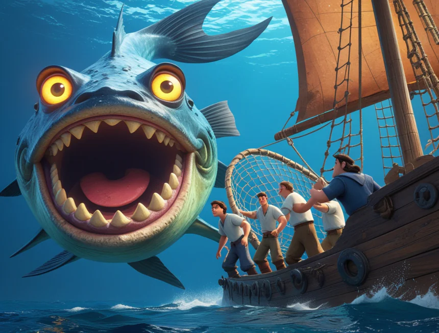 Bir başka gün, masmavi denizin ortasında garip bir gölge belirmiş. Gemi yaklaşınca bir de ne görsünler? Dev gibi bir balık, koca ağzını "şlak şlak şlak" diye açıp gemiye doğru yüzüyormuş! Tayfa korkudan "Aman Allah'ım!" diye haykırmış. Balığın gözleri birer fener gibi parlıyormuş. Murat, balığı şaşırtmak için bir plan yapmış.