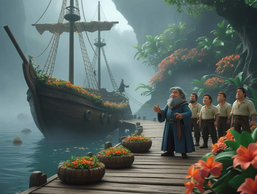 Yolculuk devam ederken, gemileri sisli bir adaya yanaşmış. Ada mis gibi çiçek kokuyormuş. Adadan çıkan yaşlı, güler yüzlü bir adam, onları "Hoş geldiniz, yorgun misafirler!" diye karşılamış. Adam onlara tatlı içecekler sunmuş, şarkılar söylemiş. Ama Denizci Murat'ın içine bir kurt düşmüş. Bu adada bir terslik varmış. "Hımmm," diye düşünmüş.