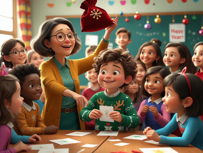 Sınıfın en heyecanlı öğrencisi, kıvırcık saçlı Can imiş. Çünkü o gün sınıfta "Yılbaşı Çekilişi" yapılacakmış! Sevgi Öğretmen, elinde kırmızı bir torbayla sınıfa girmiş. Gözlüklerinin üzerinden gülümseyerek, "Evet çocuklar, herkes bir kağıt çekecek ve ismi çıkan arkadaşına gizlice bir hediye alacak. Ama sakın kimse söylemesin, bu bir sır!" demiş.